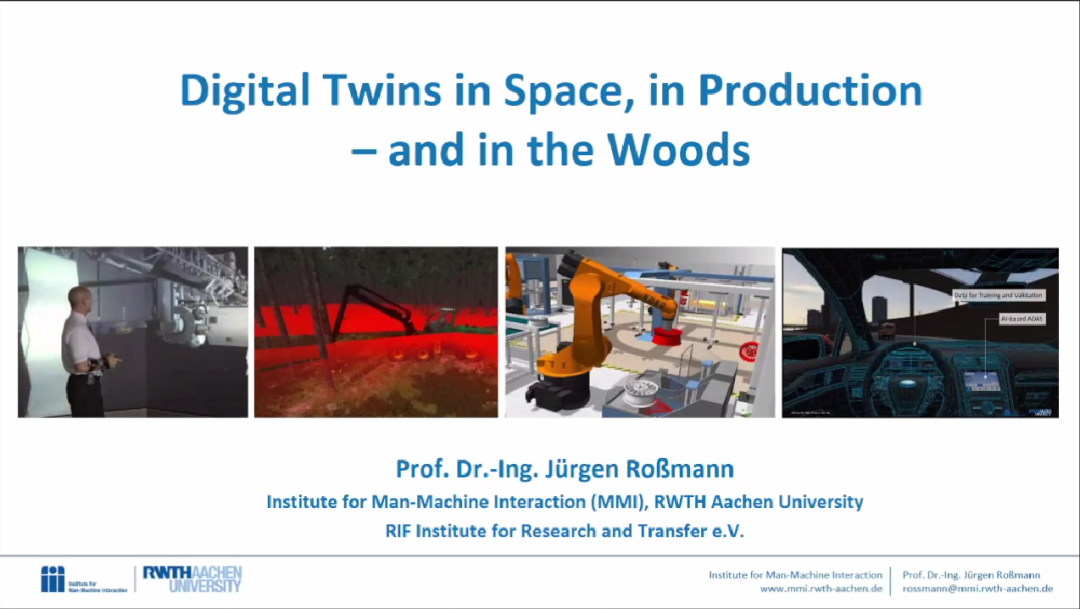 第一个主题的主讲人Jürgen Rossmann是德国国家科学与工程院院士,德国亚琛工业大学教授、人机交互研究所所长,多特蒙德计算机集成制造中心董事会成员,国际机器人和自动化会议计划委员会委员。主要研究领域为数字孪生技术、自动化、机器人、信息技术和系统与控制。报告的题目为《Digital Twins in Space, in Production – and in the Woods》。