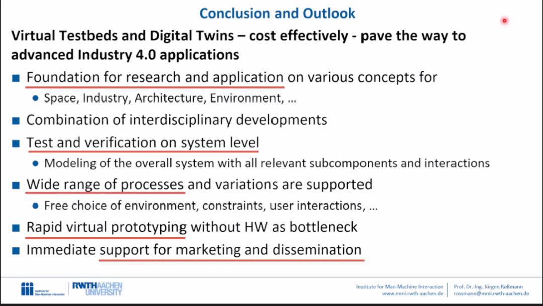 Jürgen Rossmann教授开门见山地通过几个小动画让同学们更加清楚地认识到数字孪生技术的应用场景和数字孪生技术从研究到生产的过程。他指出,现在数字孪生技术磅礴发展,有些已经演变成产品,而且现在部分数字孪生技术的公司仍然存在且活跃。之后教授讲述了数字孪生技术的特点,它是对现实世界的一比一复刻,目前主要依靠传感器,是物品、服务与人互联的节点。数字孪生技术可以预测未来并且顺应未来。
