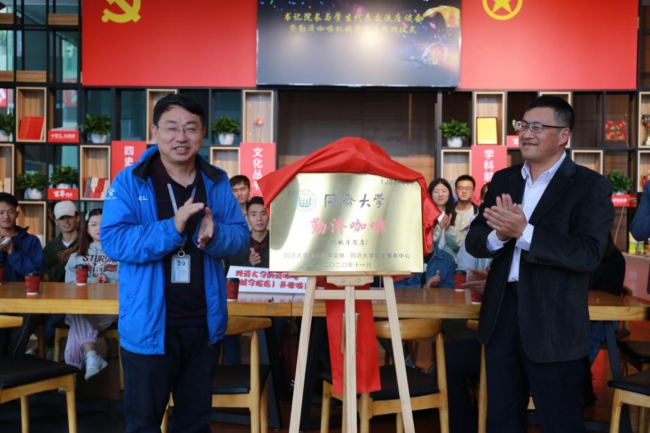 院长卞永明教授和学研工部副部长徐纪平老师共同为勤济咖啡机械学院店揭牌,勤济咖啡机械学院店正式开业。