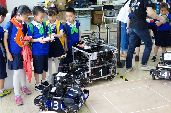 随后一行人来到德楼参观了我院大学生创新创业基地,由我院机器人队的工作人员对基地和赛事进行相关介绍讲解,在观看我院同学的比赛视频后,工作人员拿出机器人实物在小朋友面前秀了一番操作,赢得小朋友们的阵阵喝彩。接着,小朋友也亲身体验了机器人实操,大家互相交流过后,合影留念,本次活动圆满结束。