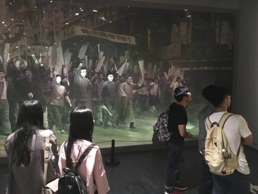 我们印象最深刻的是一个集3D投影、舞蹈、诗词和故事的二十四烈士雕塑多媒体剧场表演。它利用高科技全息技术将雕塑和舞蹈完美结合在一起,共同演绎二十四烈士感人至深、可歌可泣的事迹。突破了红色故事讲述和高科技展项分离的模式,将两者结合在一起,迸发出新火花。一位倒下去的烈士,依旧擎起一支手,指着前方,用自己的信念教导着身后的人们前赴后继,为了革命抛头颅、洒热血,实在感人至深。