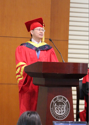党委副书记冯身洪老师代表学校致辞,他对2018届毕业生表示了祝贺,并且高度赞扬了他们在学术领域和创新实践上的成就。同时,冯老师向大家介绍了百年同济的优良传统,并对新一代年轻的毕业生寄予希望,希望他们可以像过去毕业的同济人一样,为国家、为社会贡献自己的力量。