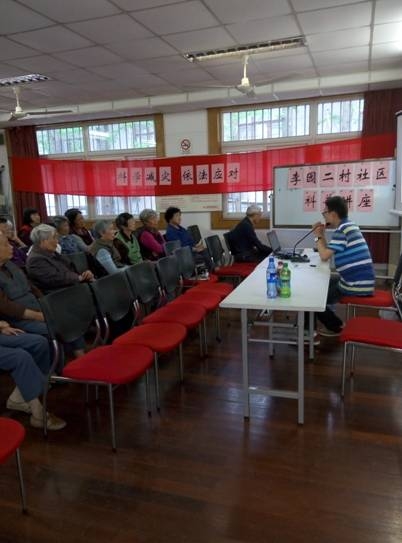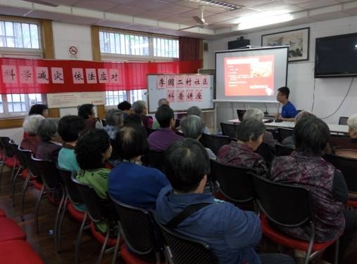 本次活动主题依然是以安全为中心,主要内容包括食品安全和各种自然灾害相关的安全知识。活动场地是李园二村居委会的多功能活动室,面对的听众主要是六十岁以上的爷爷奶奶。活动采取了以志愿者讲解为主,社区居民配合的形式。演示文稿上图文并茂,大多知识都在居民的理解范围之内,比较专业的术语则联系生活实际,尽量促进他们的理解。关耀发同学有了上一次志愿的经验,对“食品安全”演示文稿的内容作了补充和修改,讲解起来更加熟练。刘阳同学则将自己在“节能减排大赛”的关于厨房用抽油烟机的项目与演示文稿结合起来,讲解的深刻并且贴近生活。