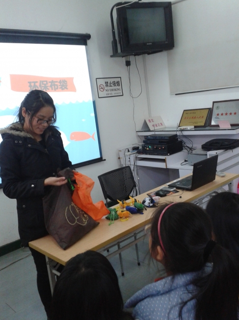 活动伊始,志愿者刘振辉为孩子们讲述了关于2030年人们未来生活的畅想,包括发达的科技、更加便捷舒适的生活等。随后,任雁同学讲述关于空气污染的知识,通过列举生活中的现象,让孩子们更加生动地了解诸如“酸雨”、“pm2.5”、“二氧化硫”等和环境密切相关的词语。接着由赵芳燕同学为孩子们讲解塑料袋等白色污染的危害,由于有了之前“青春同济,绿色同行”项目的铺垫,结合问答卡片及新闻短片,这一讲解显得形式多样、内容生动,孩子们听得也很投入。