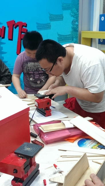 我院也有两组学生不仅现场指导居民,也参与到了比赛中。在规定的时间内,他们利用现场的台式锯床、钻床和磨砂轮制作出了一件多功能储物架和一个机械手。学生的精巧设计和精细制作引起了在场居民的极大好奇,学生向居民们解释了榫卯结构和多杆传动的原理,使居民感触颇丰。在制作中,两组学生也积极向一位参加比赛的社区老木工请教木工知识,努力提高自己的制作水平。这次活动,我院学生向居民传播知识,从居民那里学到生活的经验和小窍门,互相学习让创意的火花迸发,共同探讨生活中的创新想法。