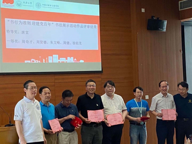 学院于6月22日下午在开物馆101报告厅举行的全院教职工大会上对书法活动获得特等奖和一等奖的老师颁发了荣誉证书,院党委书记宋木生还带领老师们学习了习近平总书记关于师德师风的重要论述,并对《新时代高校教师职业行为十项准则》逐条进行了解读,院长卞永明介绍了《暗网禁区