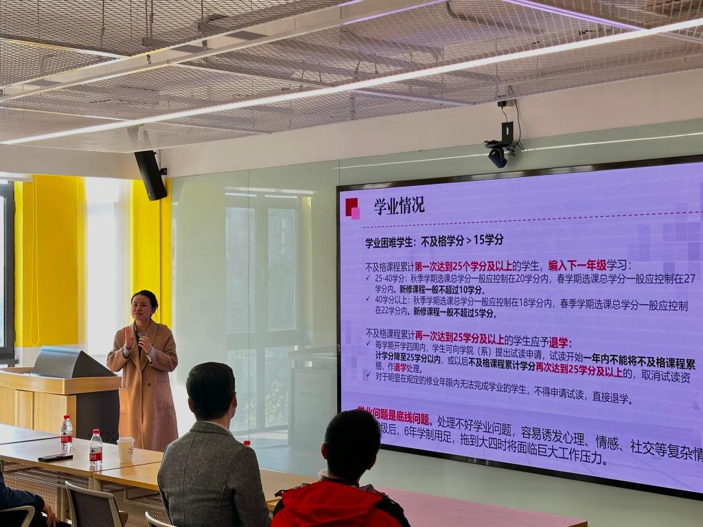 辅导员王佳琪老师分析了本科生存在的主要学业问题,介绍了学院学业帮扶工作的内容与成效,并对班主任如何开展学业帮扶工作给与建议。辅导员钱偲老师详细介绍了奖助学金的构成、评审制度、评审流程以及班主任开展相关工作时的注意事项,并对我院今年毕业生就业情况进行分析汇报。