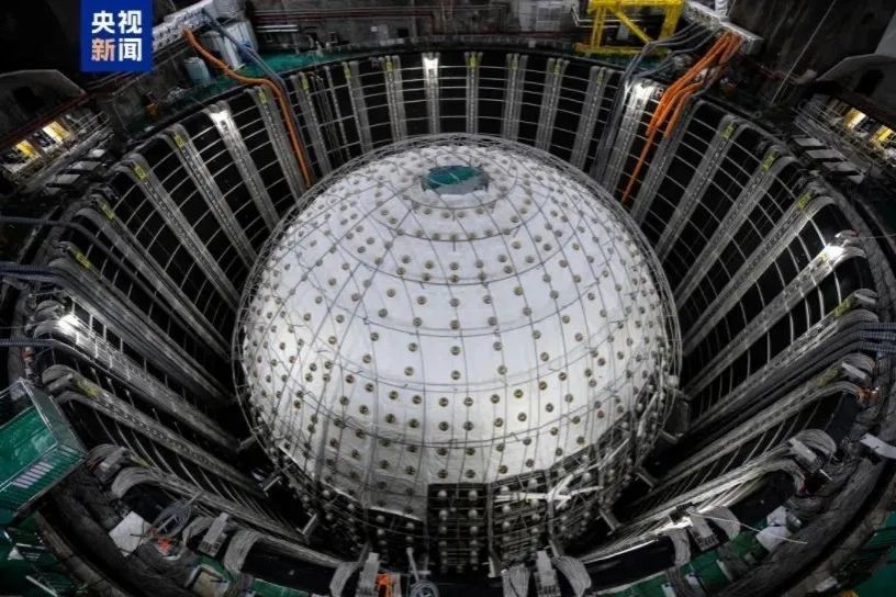江门中微子实验室作为中国科学院和广东省共同建设的大科学装置,是我国主导的大型国际科学合作项目,以测定中微子质量顺序、精确测量中微子混合参数为主要科学目标,并进行其他多项科学前沿研究。其核心探测设备——中微子探测器位于地下实验大厅的水池中央,由直径41米的不锈钢框架、直径35.4米的有机玻璃球,以及2万吨液体闪烁体、4.5万只光电倍增管等关键部件组成。