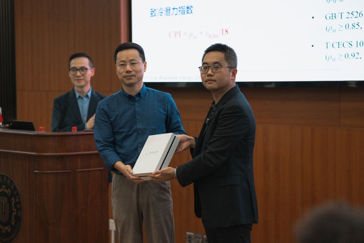 在讲座中,冯驰教授首先分享了被动式辐射致冷技术的基础原理,重点分析比较了两种用于计算长波辐射计算模型的在原理和预测精度上的差异,并分析了大气窗口对的长波辐射散热的重要性;其次,探讨了被动式辐射致冷技术在建筑、交通、能源等领域的实际应用案例,评估其节能潜力和经济效益;再次,针对当前被动式辐射致冷技术在推广过程中面临的挑战,如材料的耐久性、光污染以及冬季副作用等问题进行展望,提出可能的解决方案和改进措施;最后,冯驰教授耐心地回答了在场师生的相关问题。学院副院长高军教授代表学院向冯驰教授增送了纪念品以示感谢。